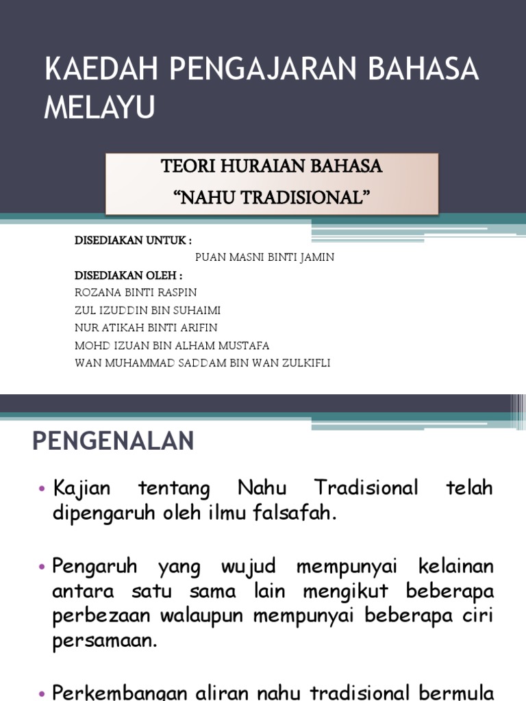 Para pelajar juga perlu mengetahui maksud istilah morfem dan kata. Nahu bahasa Melayu didasari oleh aspek fonologi yang mengkaji sistem dan fungsi bunyi bahasa dengan penekanan kepada segmen konsonan dan vokal yang berperanan utama dalam membentuk sesuatu morfem dan kata Zaharani et al. Pronomina persona bahasa Melayu kelihatannya hanya dibincangkan oleh orang Eropah apabila mereka sudah mempunyai kesedaran untuk menulis nahu Melayu.